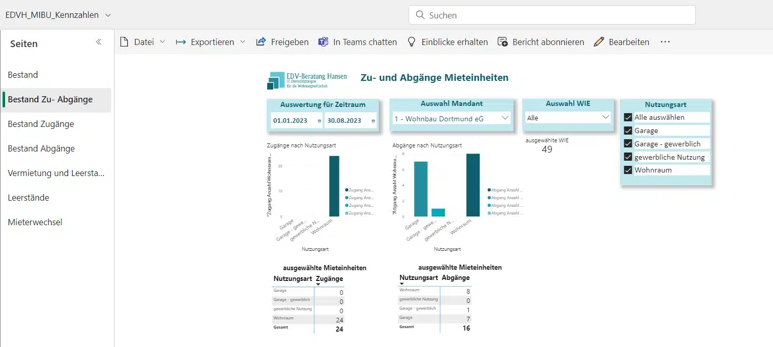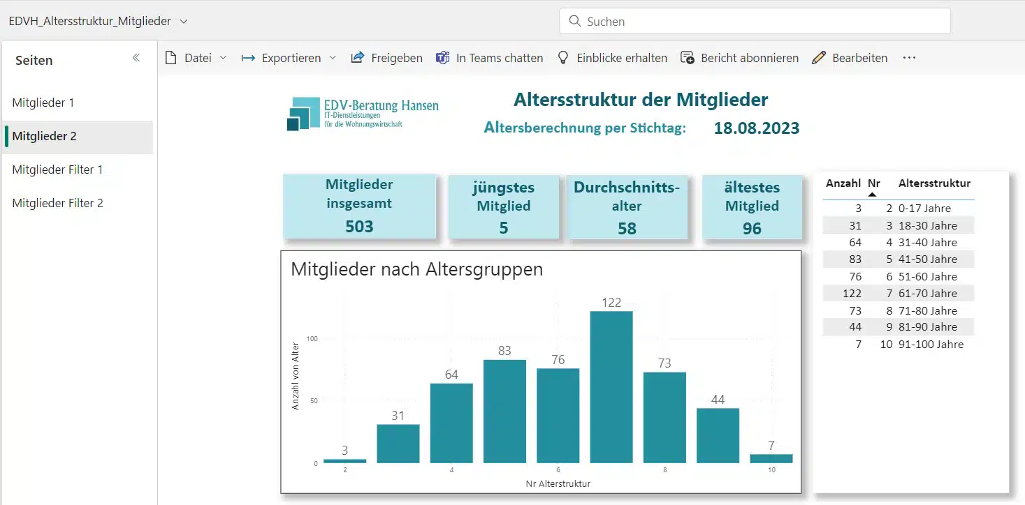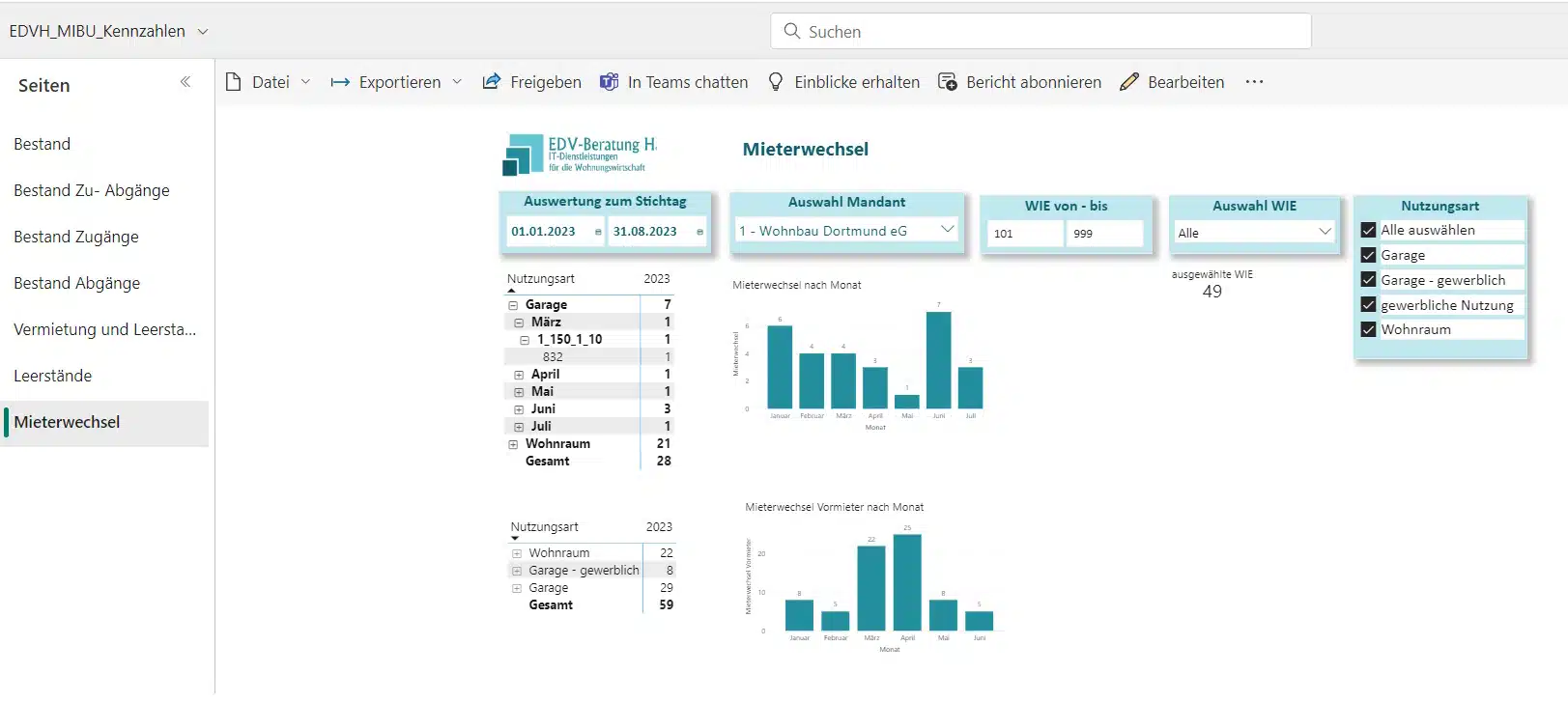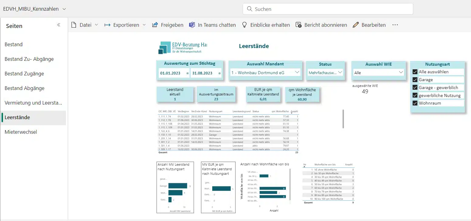 über Bestands­aus­wer­tun­gen im Miet­ma­nage­ment bis hin zu kom­ple­xe­ren Aus­wer­tun­gen für die Bereiche Woh­nungs­wirt­schaft, Rech­nungs­we­sen, dem Bestands­ma­nage­ment sowie der Mit­glie­der­ver­wal­tung.